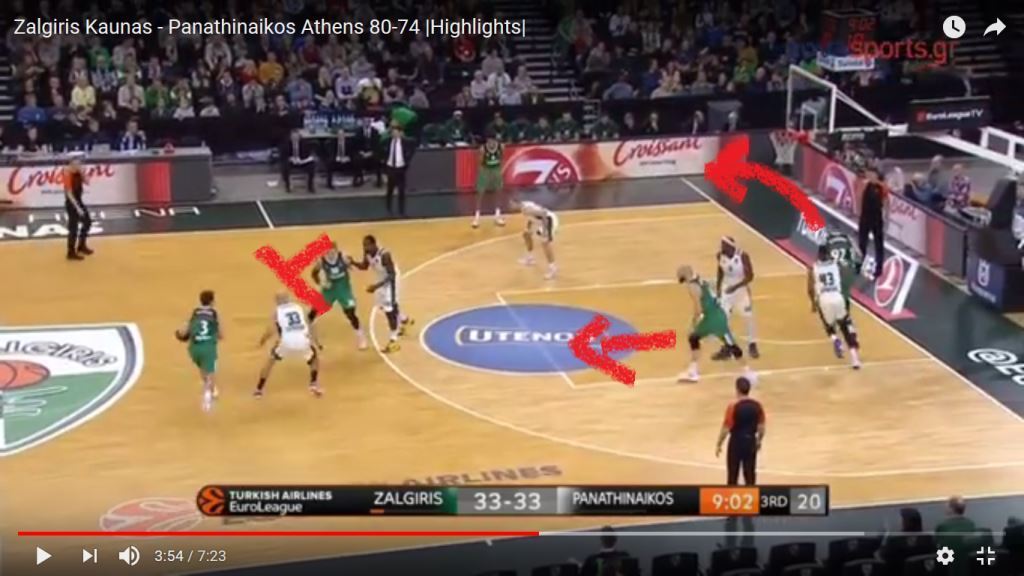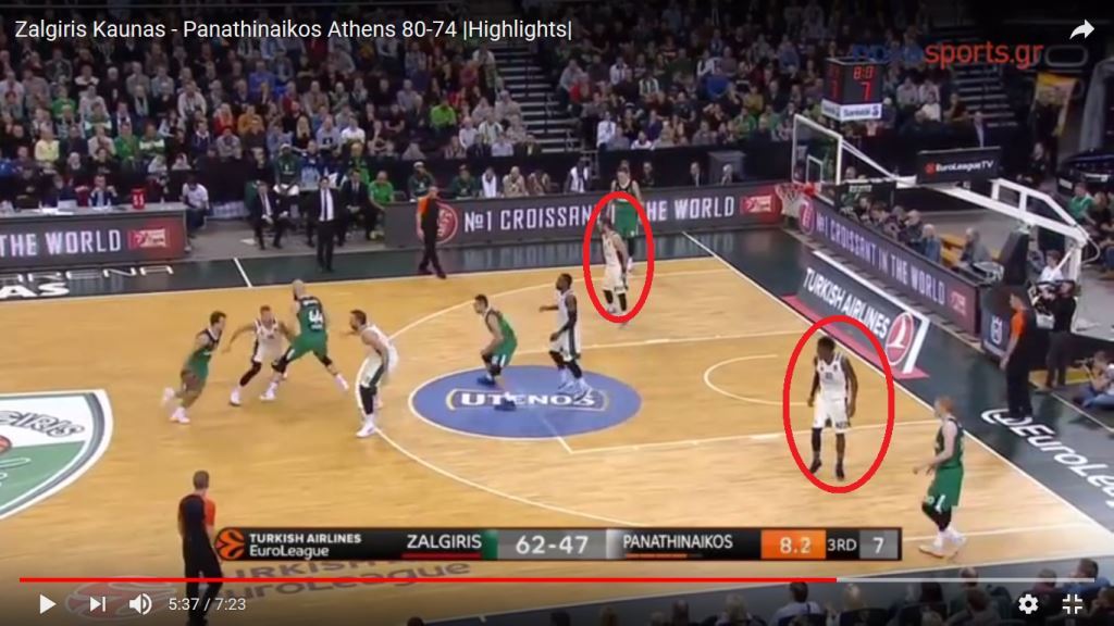 Nαι, για μία ακόμη φορά η προσοχή πέφτει στον παίκτη που καλείται να αμυνθεί αργότερα στο χρόνο επίθεσης, μακριά από τις αρχικές δράσεις, και στις αποφάσεις αυτού. Εδώ συμβαίνουν δύο πράγματα. Πρώτον, ο Μιλάκνις κινείται να πάρει την μπάλα στο τρίποντο, όπως δείχνει το βελάκι. Δεύτερον, εκεί στο "γυρω γύρω όλοι" της ρακέτας (ένας ακόμη συνωστισμός), ο Γιανκούνας δίνει ένα σκριν στον Πάνγκος, προκειμένου εκείνος να κατευθυνθεί προς την γωνία. Ο Ντατόμε , στο αμυντικό σχέδιο του Ζοτς, δεν είναι επιφορτισμένος με προσωπικό μαρκάρισμα, στην τελική αν ο Άρον Ουάιτ πάει προς τα μέσα, ο Βέσελι θα του φάει το λαρύγγι. Παρότι ο Νάναλι ακολουθεί σωστά τον σουτέρ, ο σωσίας του Χάρη Γιαννόπουλου αποτυγχάνει να αναγνωρίσει τον άλλο κίνδυνο και η στιγμιαία βοήθεια του είναι προς την λάθος (τελικά) κατεύθυνση. Ένα ακόμη ελεύθερο σουτ βγαίνει, με τον Μιλάκνις να έχει μπερδέψει τους πάντες. Το βλεπουμε αμέσως σε βίντεο λίγο παρακάτω, μαζί με την πιο όμορφη επίθεση που βρήκα όλες αυτές τις μέρες που μελετάω τους Λιθουανούς.