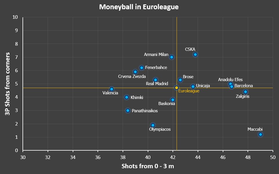 O πίνακας απεικονίζει όμορφα μία δημοφιλή αρχή του spacing. Κατά κανόνα, ο συνδυασμός των σουτ γύρω από το καλάθι και εκείνων από τις γωνίες του τριπόντου "μιλάει" για τις αποφάσεις των προπονητών σχετικά με την επιθετική κατεύθυνση. Πλην Μακάμπι, η Ζαλγκίρις είναι η ομάδα με τις περισσότερες προσπάθειες στην ρακέτα και τριγύρω, χωρίς μάλιστα να διαθέτει τους γκαρντ-τρυπάνια , όπως είναι οι Τζάκσον-Κόουλ. Από την άλλη, οι Λιθουανοί παίρνουν γενικώς λίγα τρίποντα και βασικά τα λιγότερα στην διοργάνωση πλην ... Μακάμπι. Όμως είναι οι πιο εύστοχοι από όλους, έχοντας προς το παρόν ποσοστό κοντά στο 42%. Διόλου τυχαία , μετά από 14 αγωνιστικές1 είναι η δεύτερη πιο εύστοχη ομάδα της διοργάνωσης μετά την ΤΣΣΚΑ, με 57,3% σε effective Field Goal Percentage, δηλαδή τον δείκτη ευστοχίας που υπολογίζει μαζί τρίποντα και δίποντα σε συνάρτηση με τον αριθμό κατοχών.