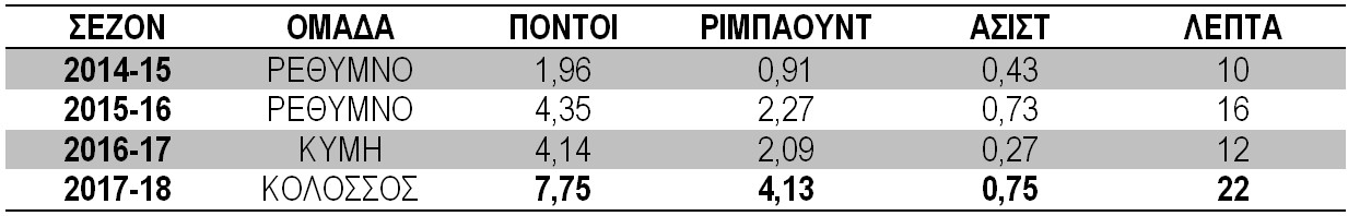 Ο 28χρονος swingman του Κολοσσού διανύει τη τέταρτη χρονιά του στην Basket League, η οποία μέχρι στιγμής είναι και η μακράν καλύτερη του σε ατομικό επίπεδο. Αν και συνήθιζε να είναι ρολίστας, πλέον περνά πολύ περισσότερο χρόνο στο παρκέ, με τις αρμοδιότητες του να είναι αυξημένες. Ο απόφοιτος του Rochester διακρίνεται για την αθλητικότητα του, ενώ σεζόν με σεζόν παρουσιάζεται όλο και καλύτερος, έχοντας πια προσαρμοστεί απόλυτα στα δεδομένα της λίγκας. Ο Άρης Λυκογιάννης τον εμπιστεύεται περισσότερο από κάθε άλλον προπονητή με τον οποίο συνεργάστηκε κατά το παρελθόν, αποτελώντας ένα πολύ χρήσιμο εργαλείο για την ομάδα της Ρόδου. Η πολύ καλή του παρουσία στο φετινό πρωτάθλημα μεταφράζεται με αριθμούς καριέρας σε όλες τις βασικές κατηγοριές του πίνακα της στατιστικής. Α, και μετρά όλα κι όλα μόλις 7 λάθη στις 9 συμμετοχές του. Παρακάτω, η πρόοδος του: